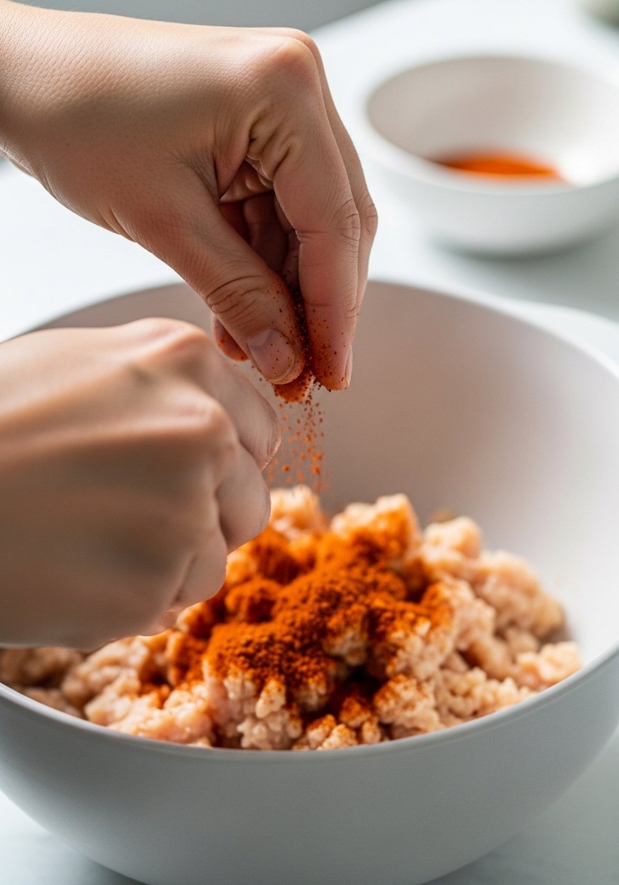 Add 1 teaspoon kosher salt per pound of ground chicken (about 5–6 g). Sprinkle the salt across the surface, then let it sit 5–10 minutes if possible to begin protein seasoning.