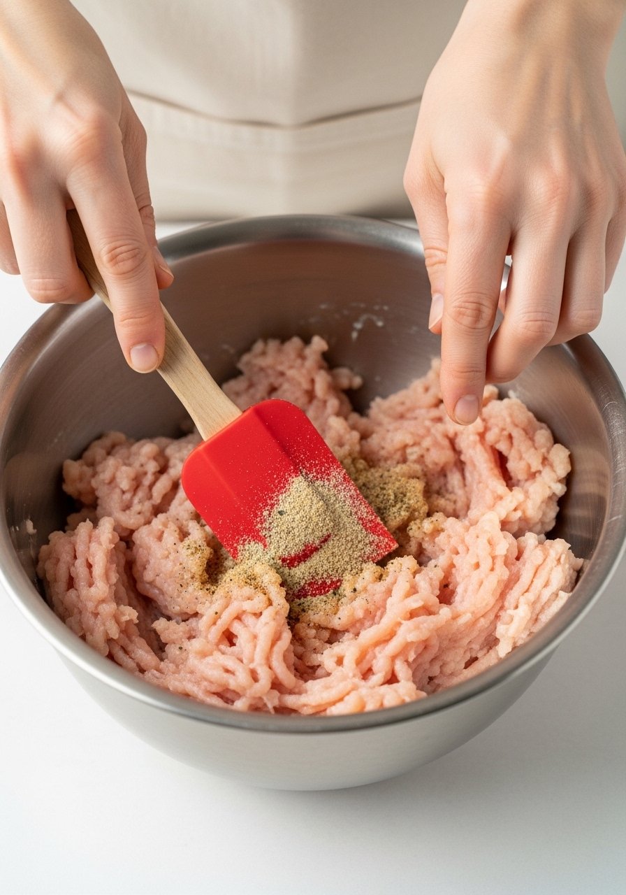 Fold with a spatula or your hands just until combined — 20–30 gentle strokes. Overworking makes patties tough. Form a tiny test patty, pan-sear a spoonful, then taste for salt and balance. Adjust seasoning in small increments and remix lightly.