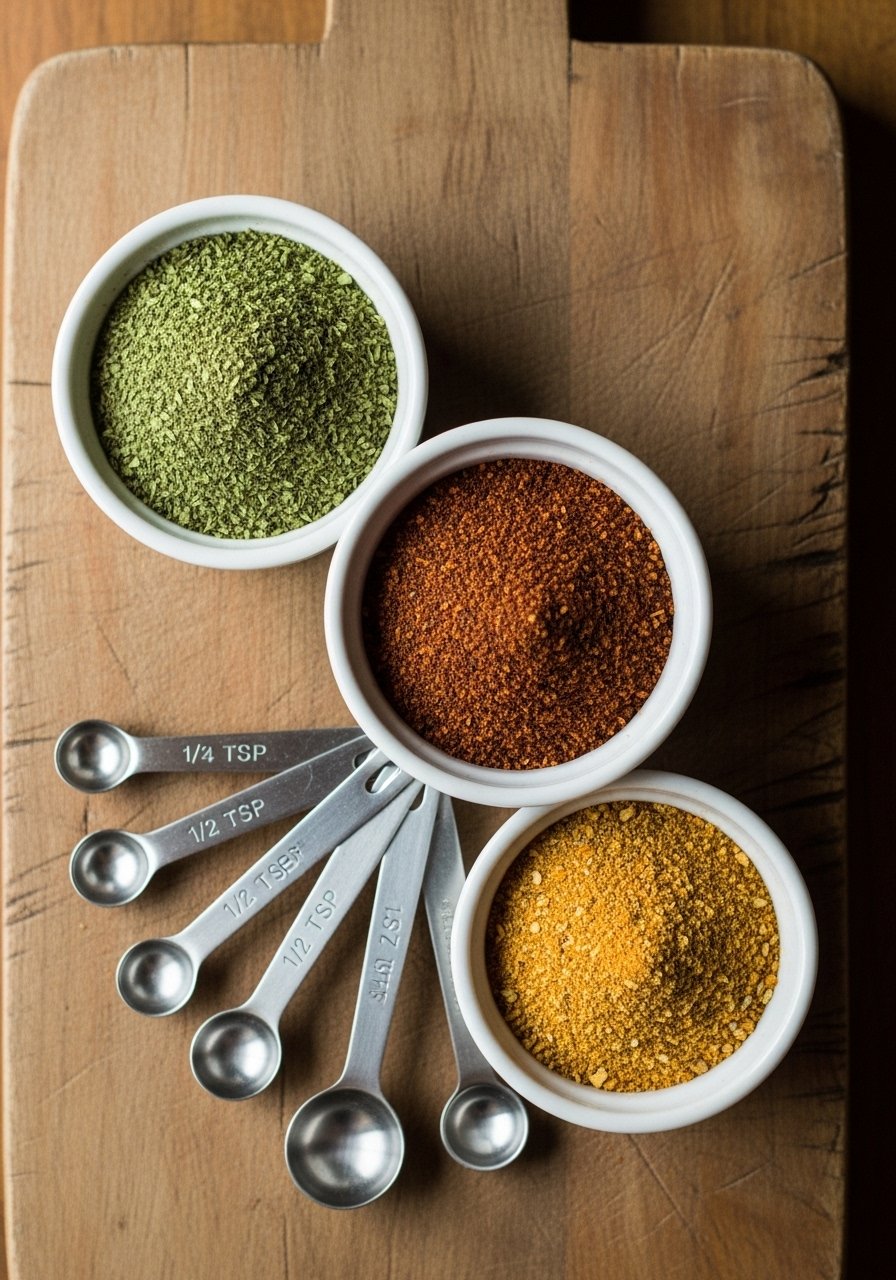 - Mediterranean: oregano, lemon zest, garlic, parsley, a pinch of cumin. Bright and herb-forward.