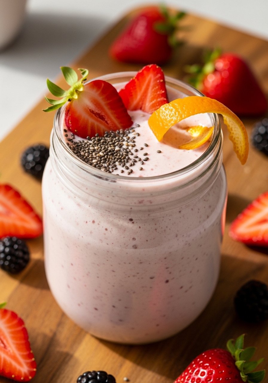 Bright, tangy, and creamy. Kefir adds probiotics while citrus and berries deliver vitamin C and antioxidants. This blender smoothie feels light but filling.