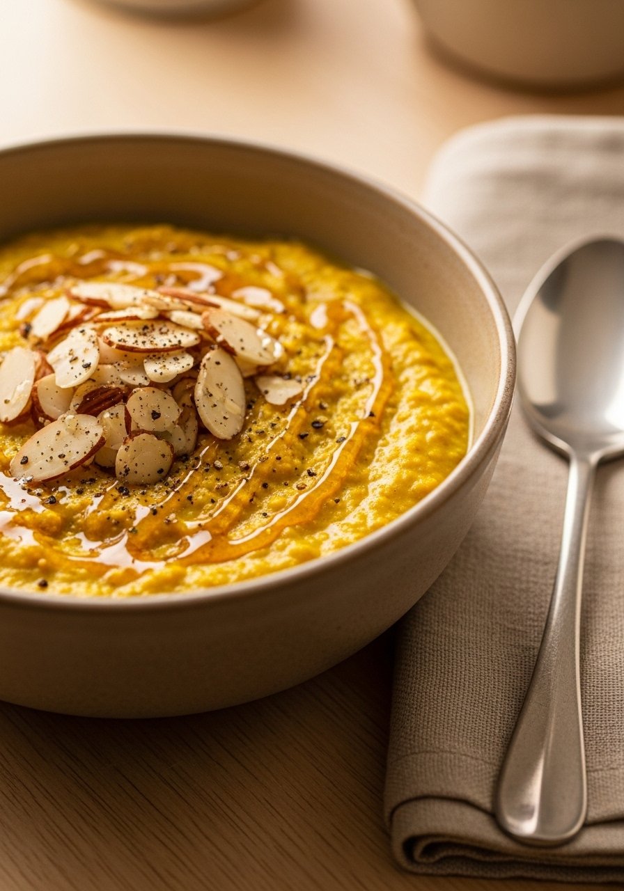- Finish and serve: Stir in maple syrup, top with almonds, and serve warm.