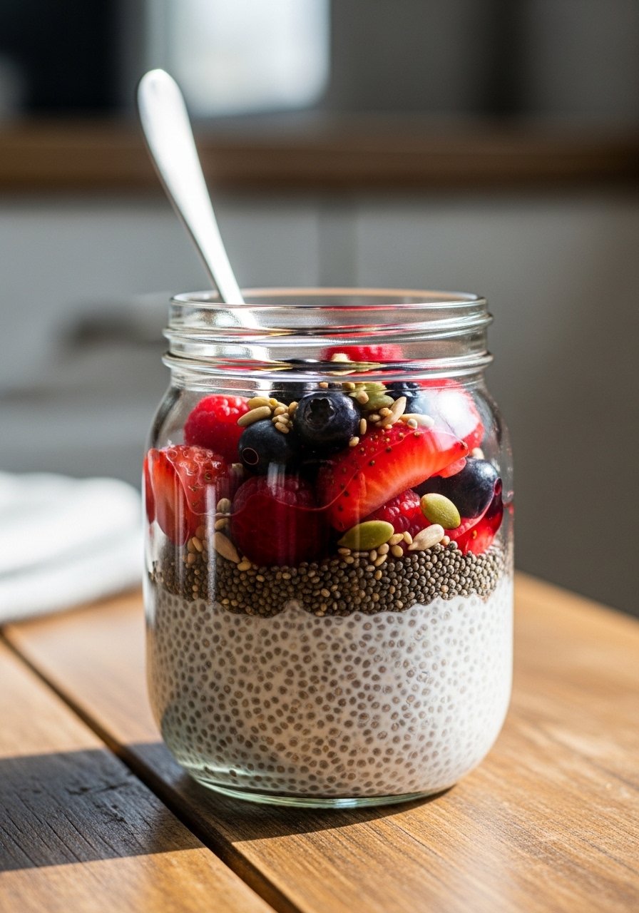 A make-ahead parfait with omega-3s from chia and vitamin C from berries. Thick, spoonable, and portable.