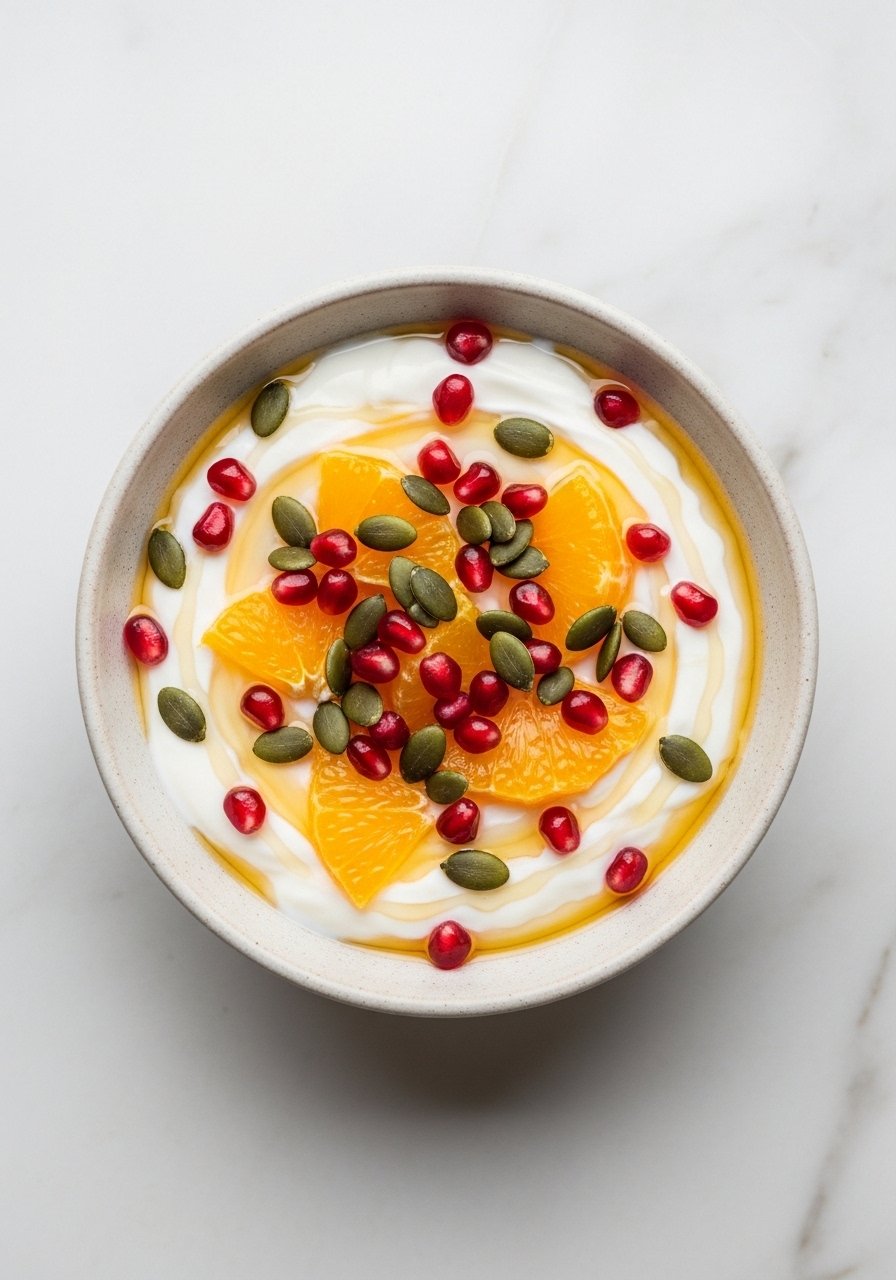 Creamy yogurt offers probiotics; citrus and pomegranate boost antioxidants. Seeds add zinc and crunch for satiety.