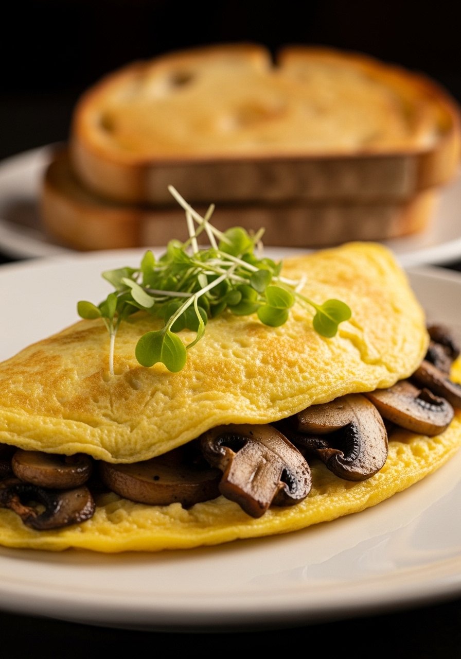 - Cook omelet: Lower heat to medium-low, pour eggs into skillet, cook 1–2 minutes until edges set, add mushroom-spinach filling, fold, and cook another 30 seconds.