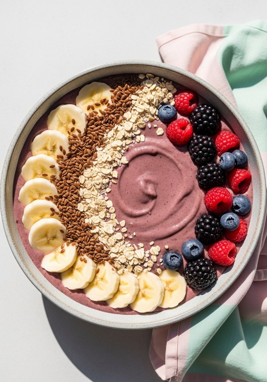- Blend base: Combine frozen banana, yogurt, oats, flax, and almond milk; blend until thick and spoonable.
