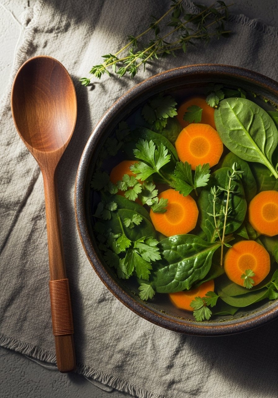 A gentle, salty broth with miso and seaweed provides probiotics and minerals. Mild tofu adds protein, creating a light, restorative bowl for digestion.