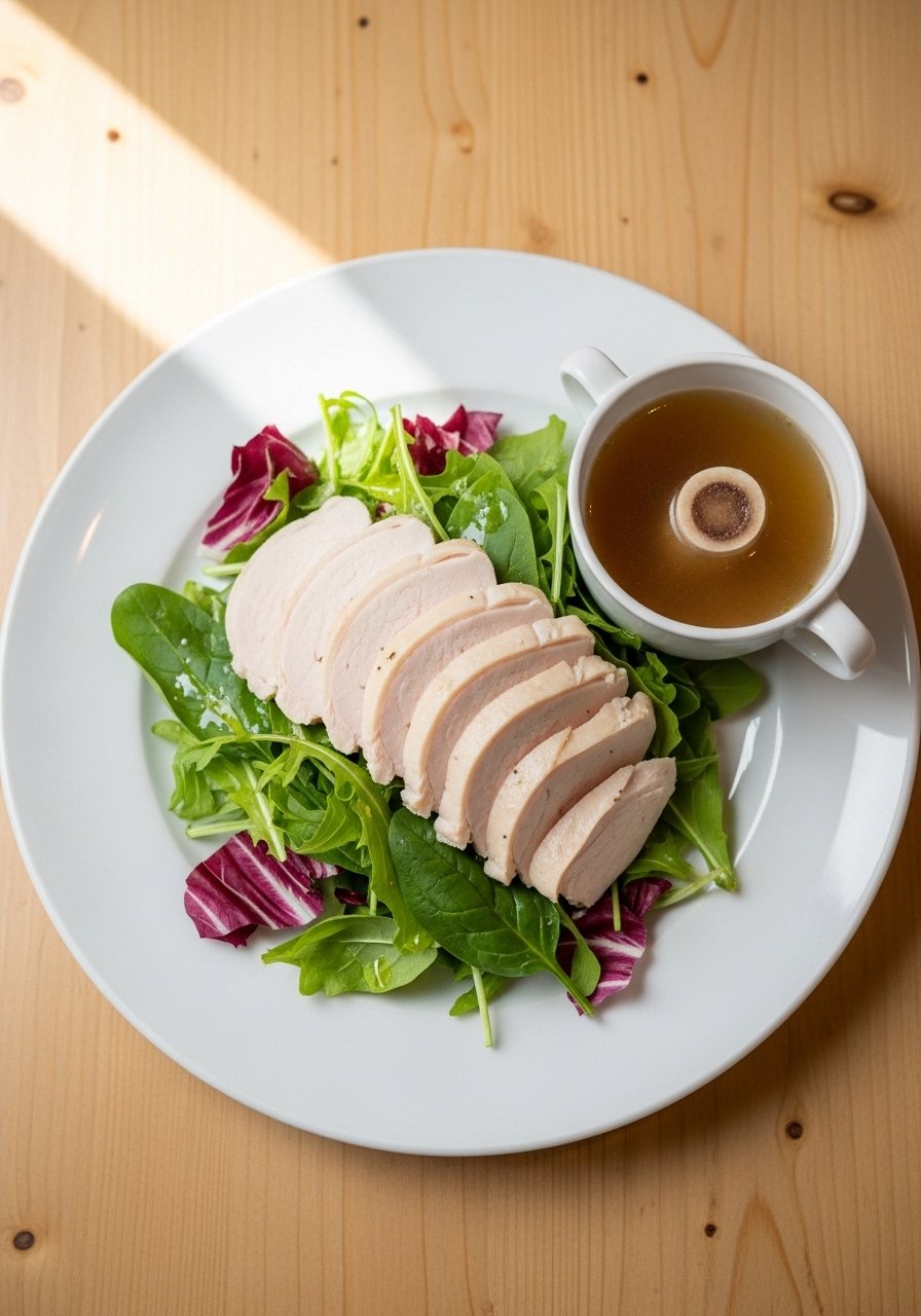 Poaching chicken in bone broth makes it tender and infused with minerals. It’s easy to digest and ideal for shredding into soups or salads.