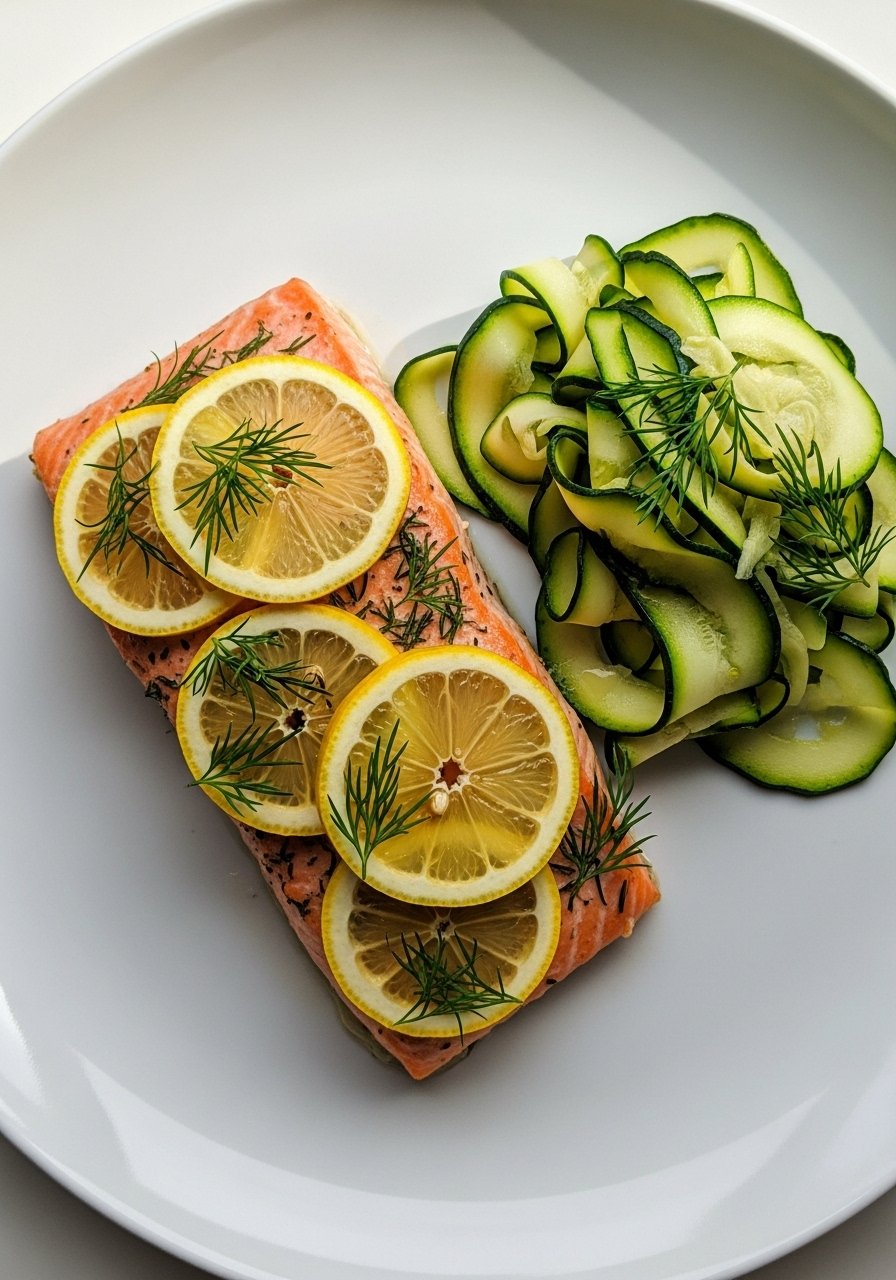 Light, flaky salmon with bright lemon and dill. Omega-3s support inflammation control, while steamed zucchini keeps texture gentle for digestion.