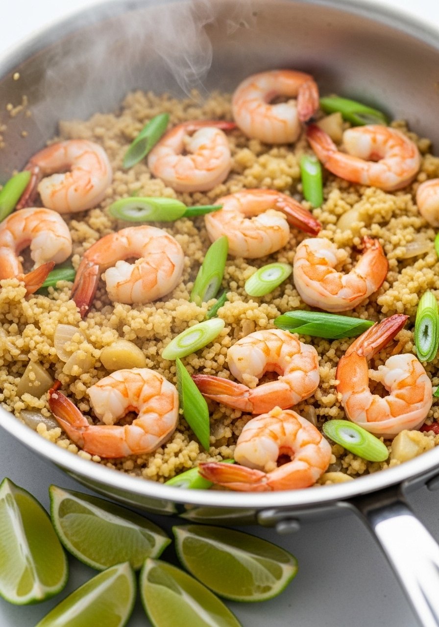 Light, low-carb stir-fry using cauliflower rice and tender shrimp. Gentle seasoning and quick cooking preserve texture and make digestion easier.