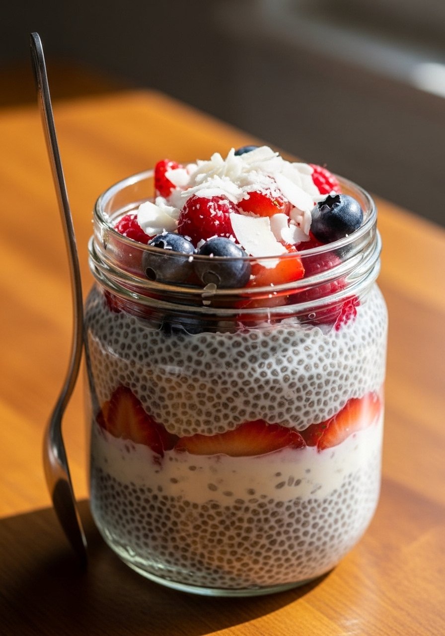 - Mix Base: Whisk chia, coconut milk, vanilla, and sweetener in a jar.