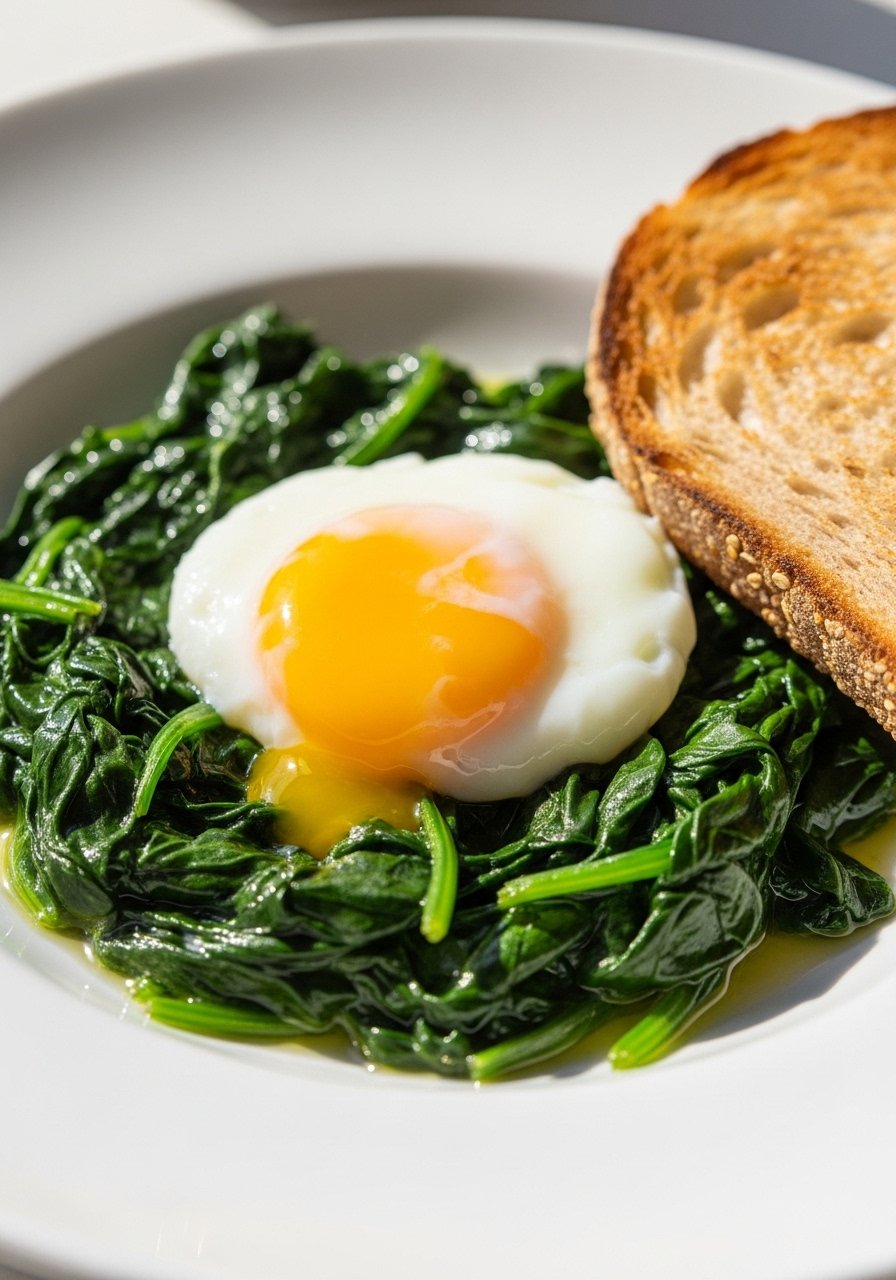 - Assemble: Place wilted spinach on plates, top with a poached egg.