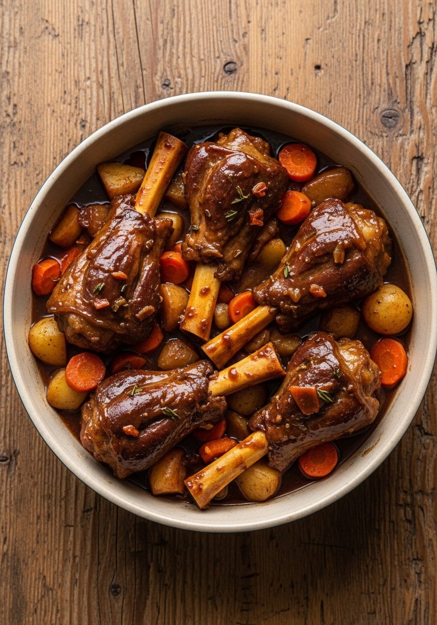 - Brown Shanks: Heat oil in a Dutch oven, brown shanks 3–4 minutes per side.