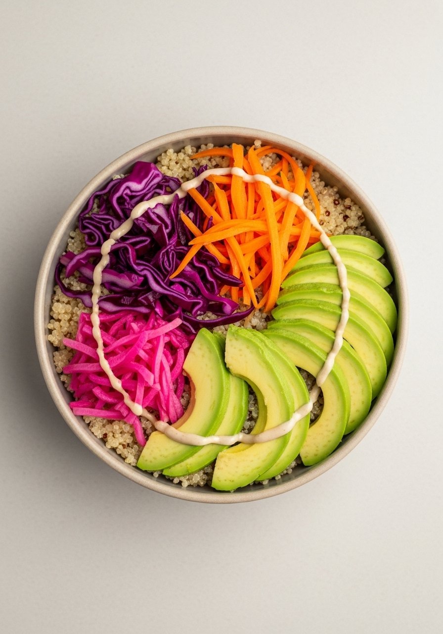 - Assemble Bowl: Place quinoa in a bowl, add fermented vegetables and avocado.