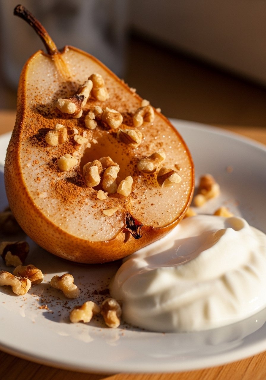 - Prep Pears: Place pear halves in a baking dish, sprinkle with walnuts and cinnamon, drizzle with honey if using.