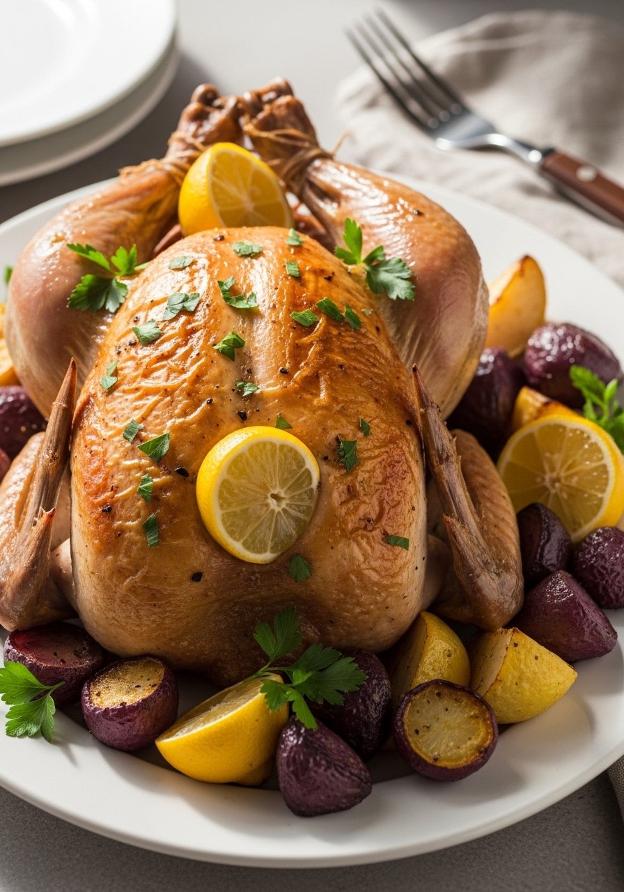 A timeless roast with aromatic lemon and herbs. The skin crisps while the interior stays juicy. Bright citrus and simple seasoning make this an easy centerplate for any night.