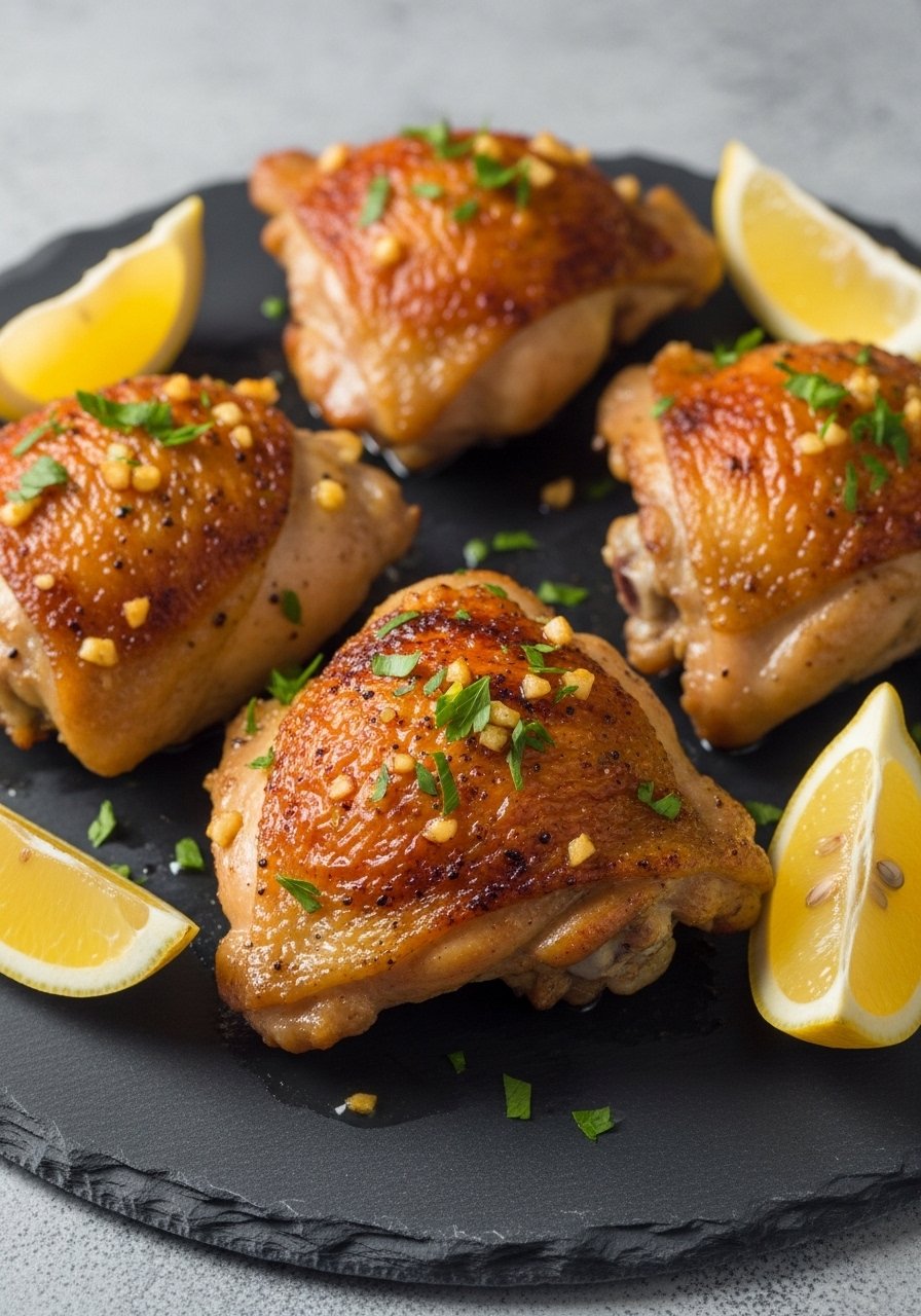 Bone-in thighs roast up with a caramelized lemon-garlic sauce. The skin crisps while meat remains tender and juicy—great for easy weeknights.