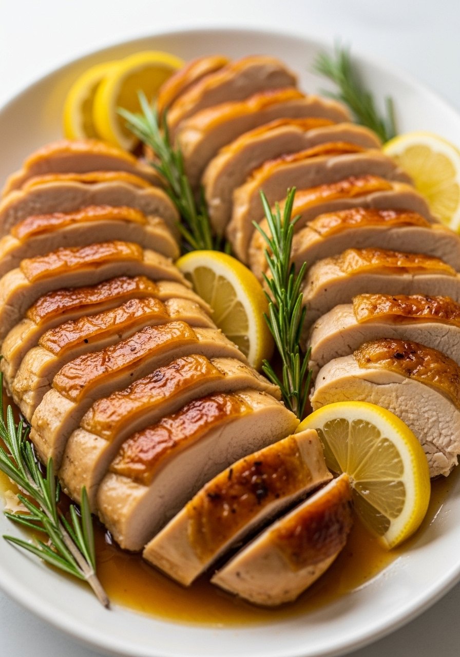 Lean chicken breasts stay juicy when roasted with lemon and rosemary. A simple method that yields flavorful slices for salads or plates.