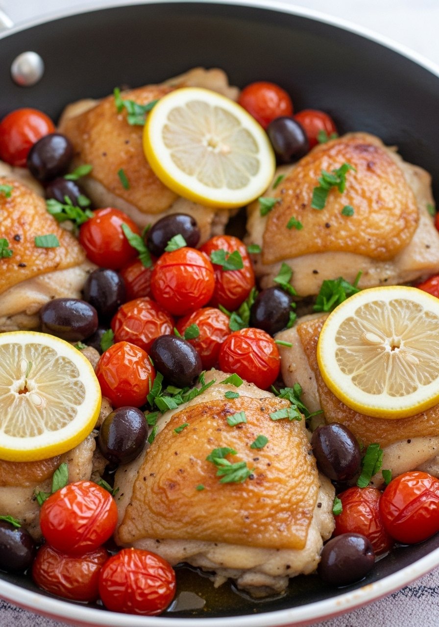 Salty olives and sweet tomatoes join lemon for a Mediterranean twist. The pan juices are tangy and savory—perfect with crusty bread or rice.