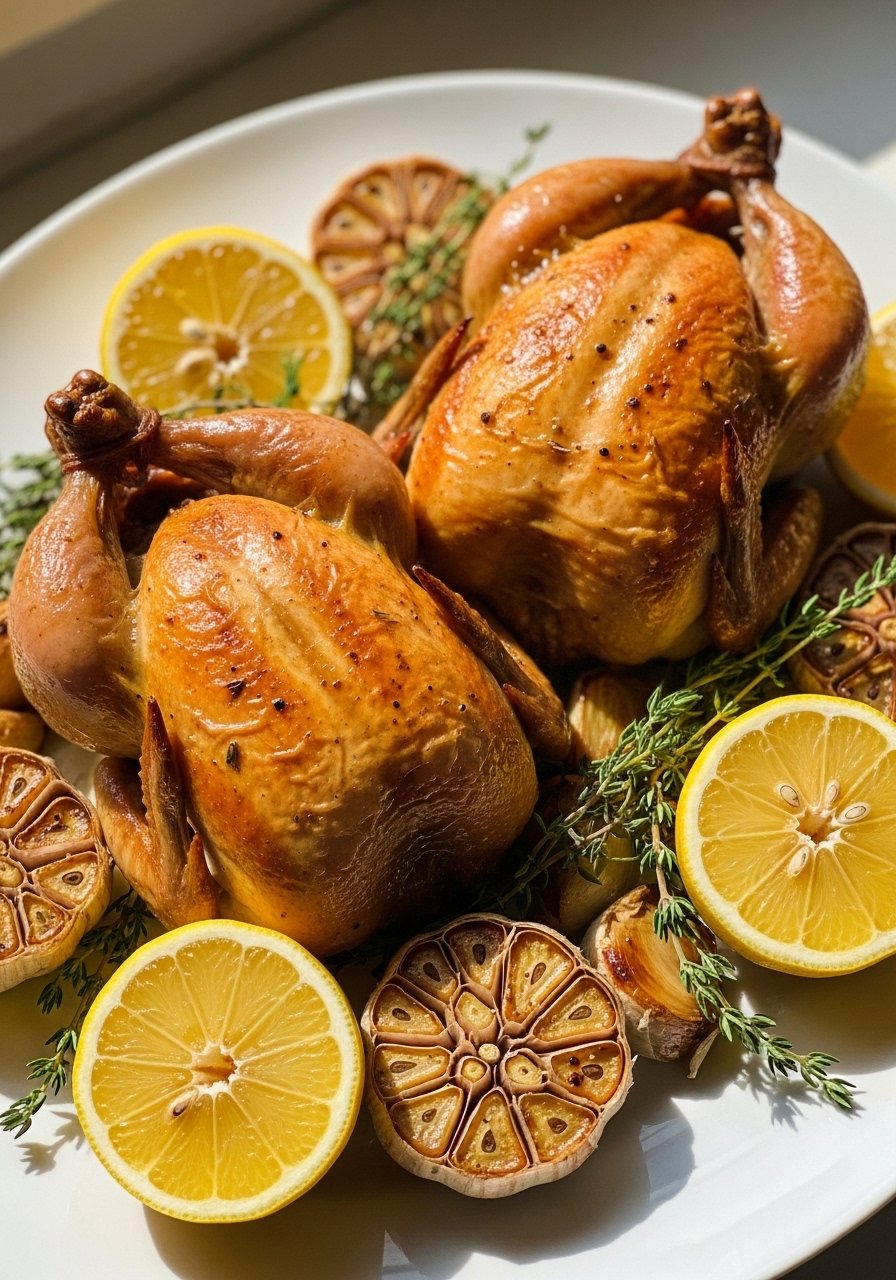 Small hens roast quickly and serve beautifully. Lemon-garlic butter under the skin yields rich, citrus-kissed meat perfect for special dinners.