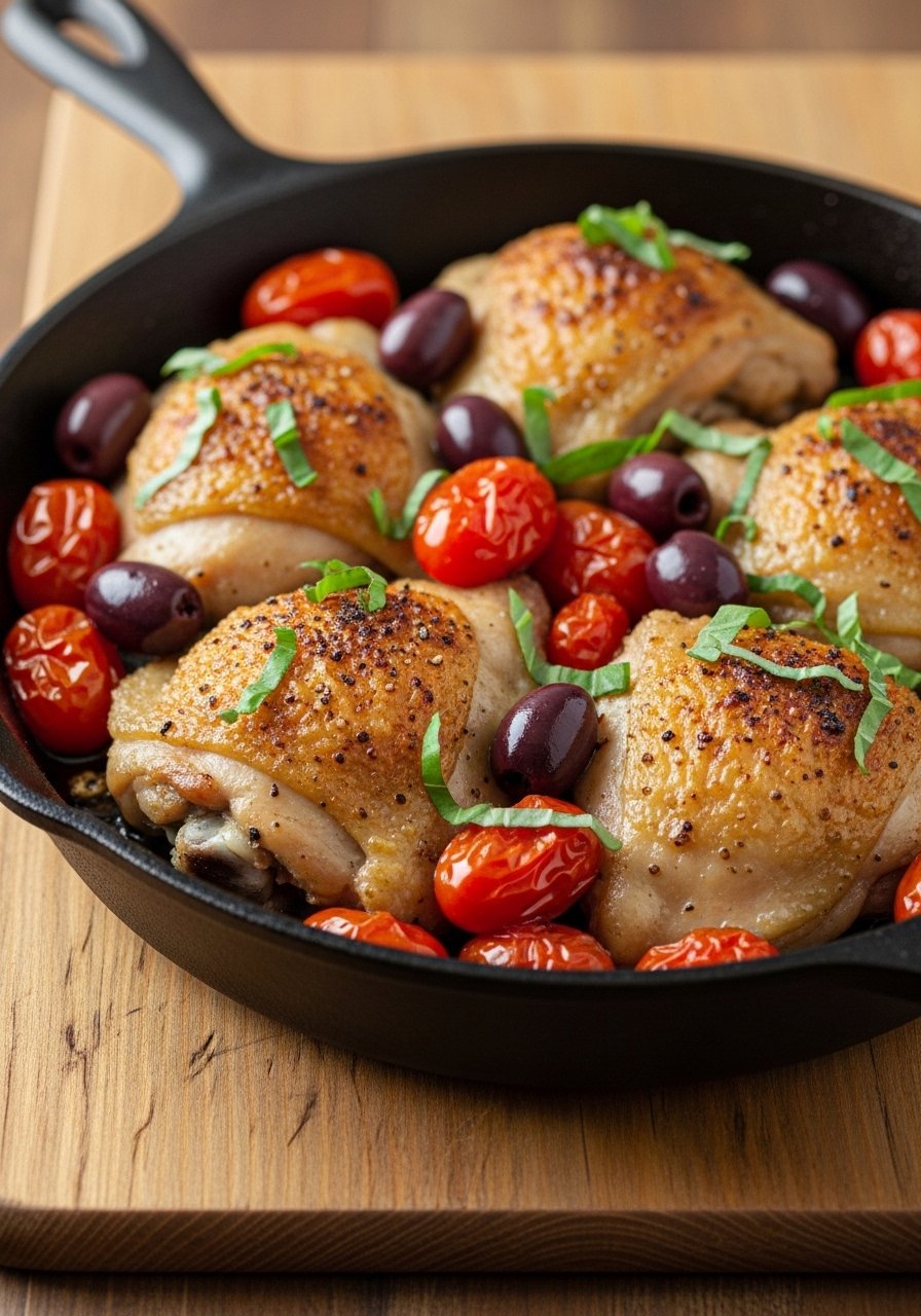 Herby chicken with tangy olives and burst tomatoes. This Mediterranean bake is savory and bright, with juicy meat and a spoonable pan sauce that’s great over rice or crusty bread.
