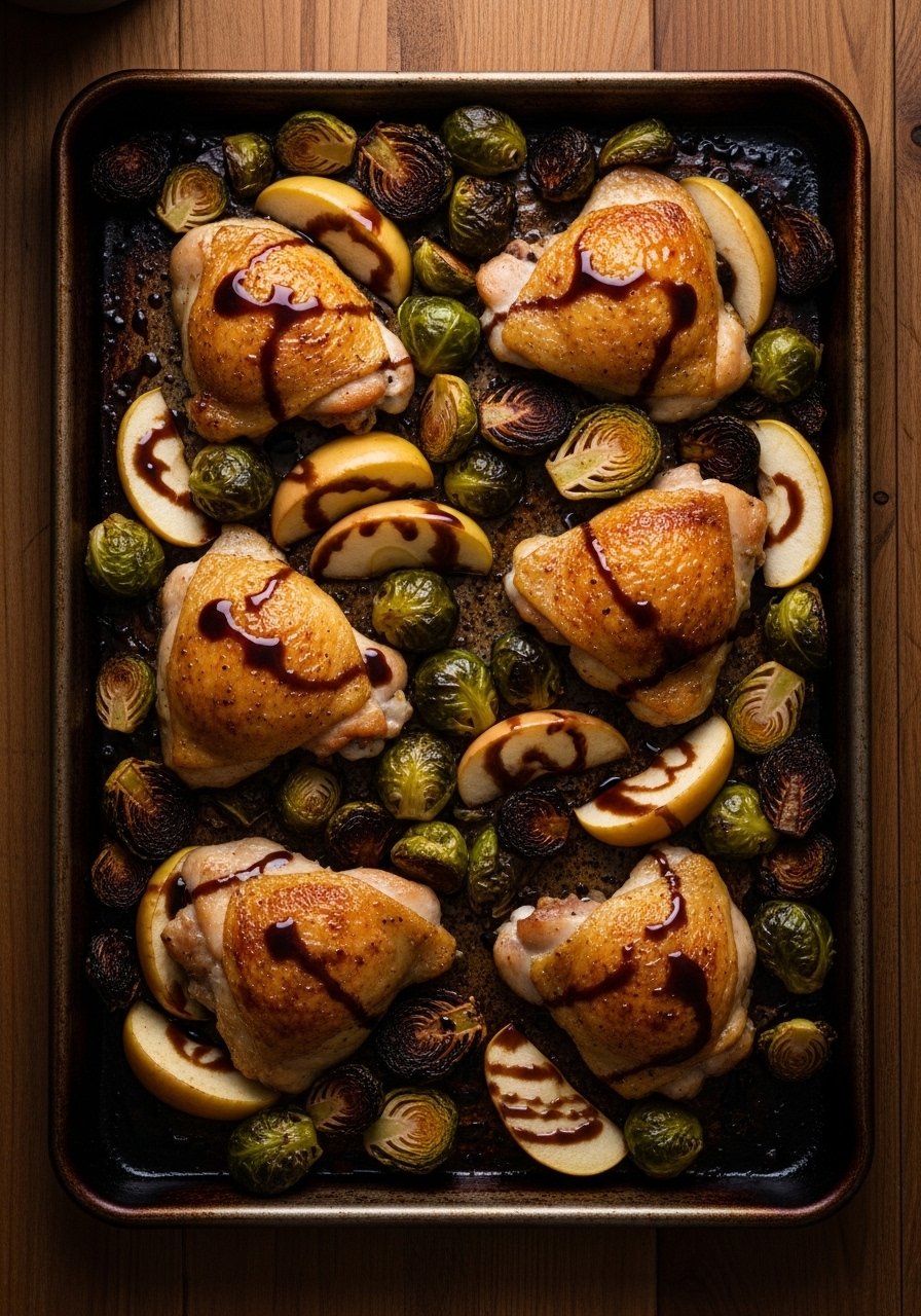 Sweet-tart balsamic complements roasted Brussels sprouts and apples for a fall-ready meal. The glaze caramelizes and creates sticky bites that pair beautifully with crispy chicken skin.