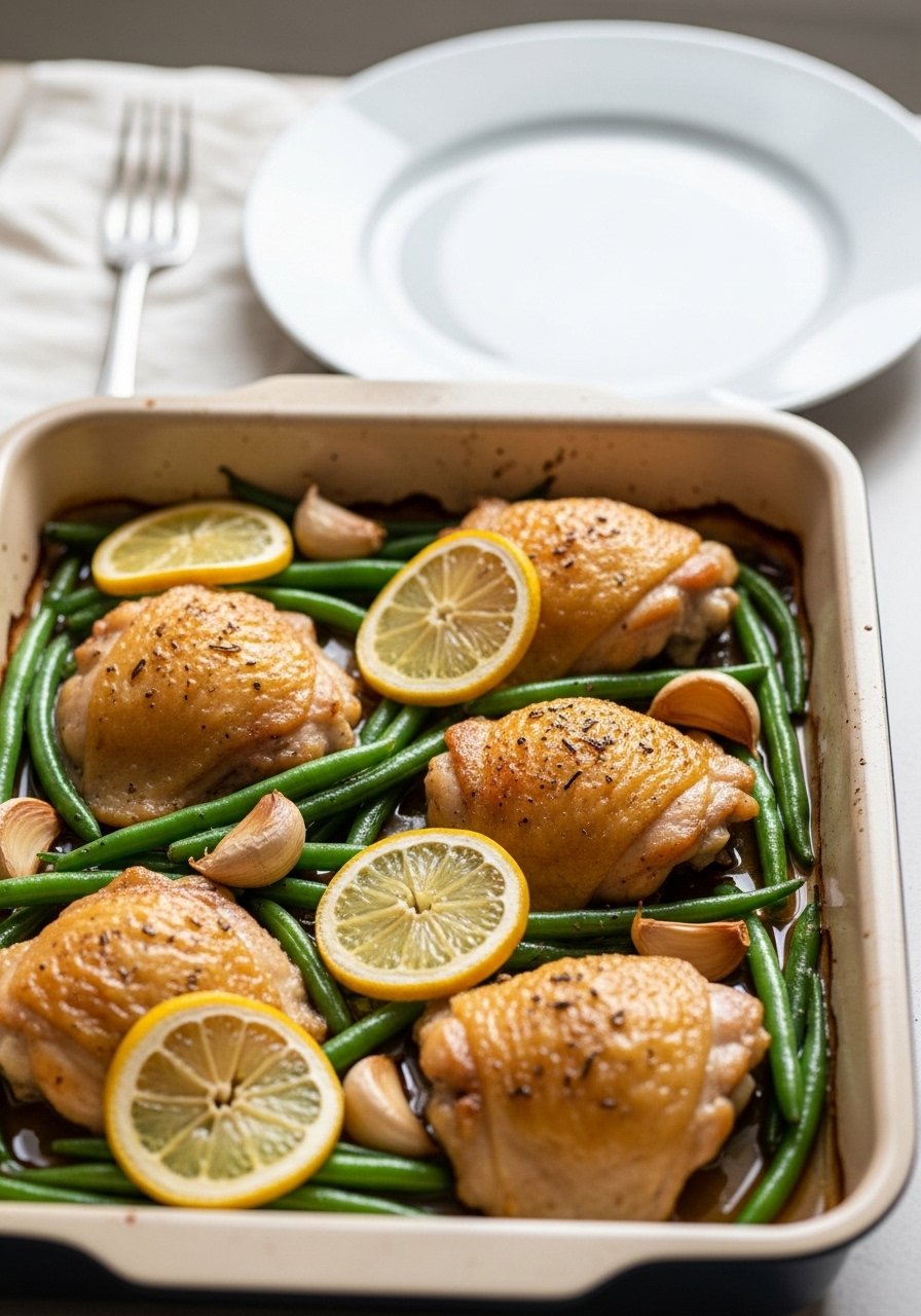 - Arrange: Place chicken on pan skin-side up and tuck beans alongside—avoid overcrowding.