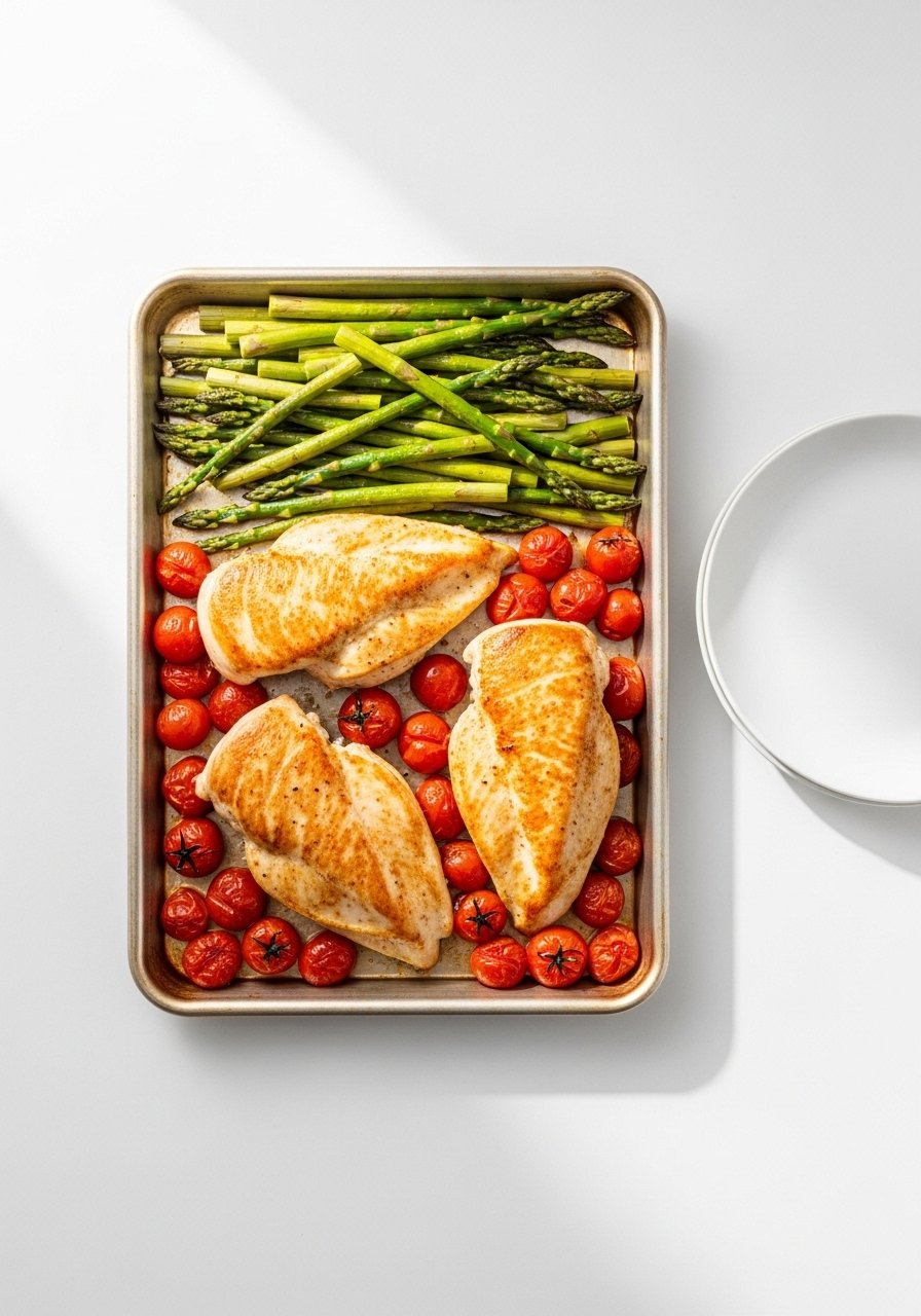 - Arrange & Roast: Spread veggies, nestle chicken, roast 30–35 minutes until chicken reaches 165°F (74°C).