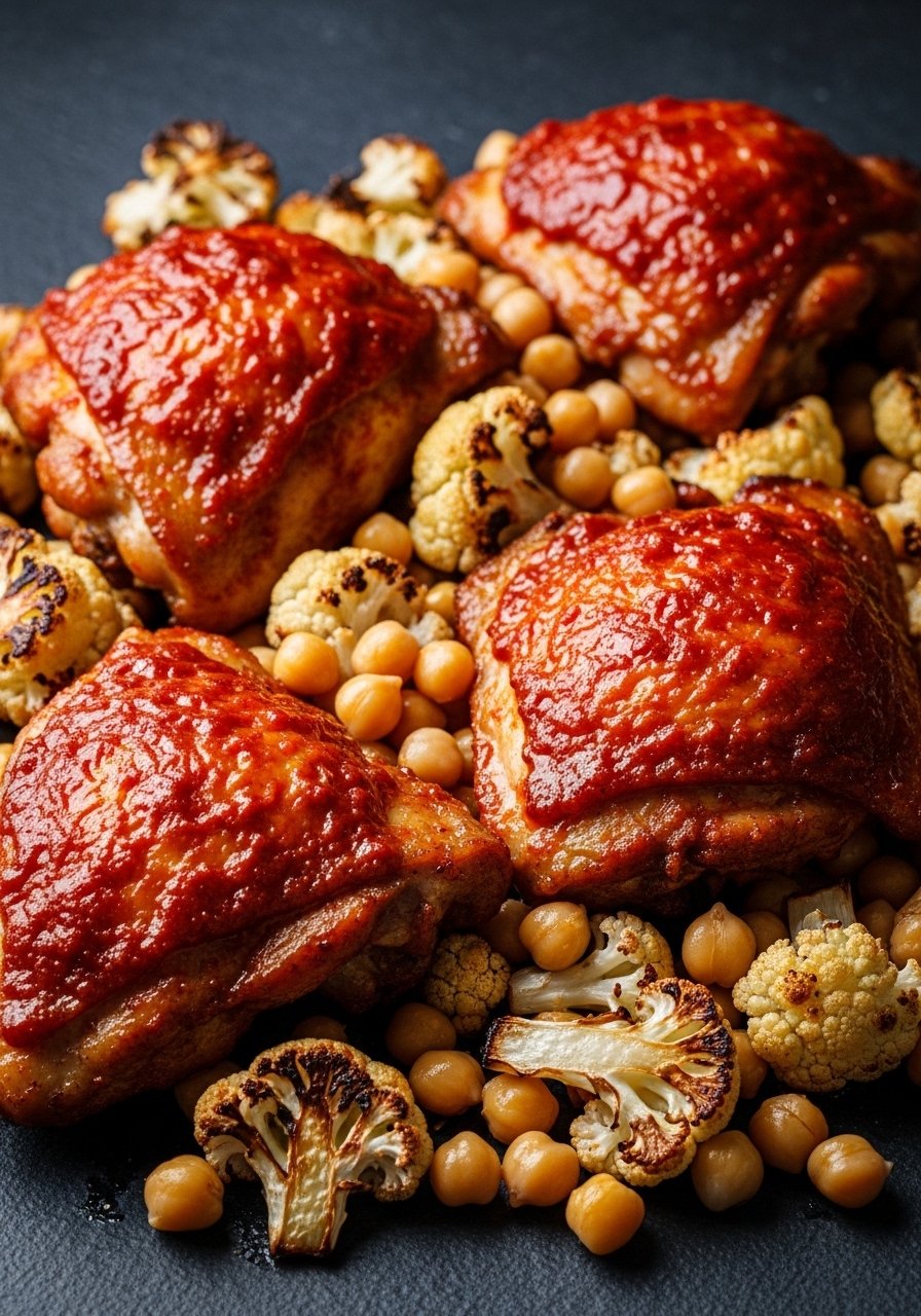 - Arrange & Roast: Spread in one layer and roast 30–35 minutes until chicken reaches 165°F (74°C) and cauliflower is golden.