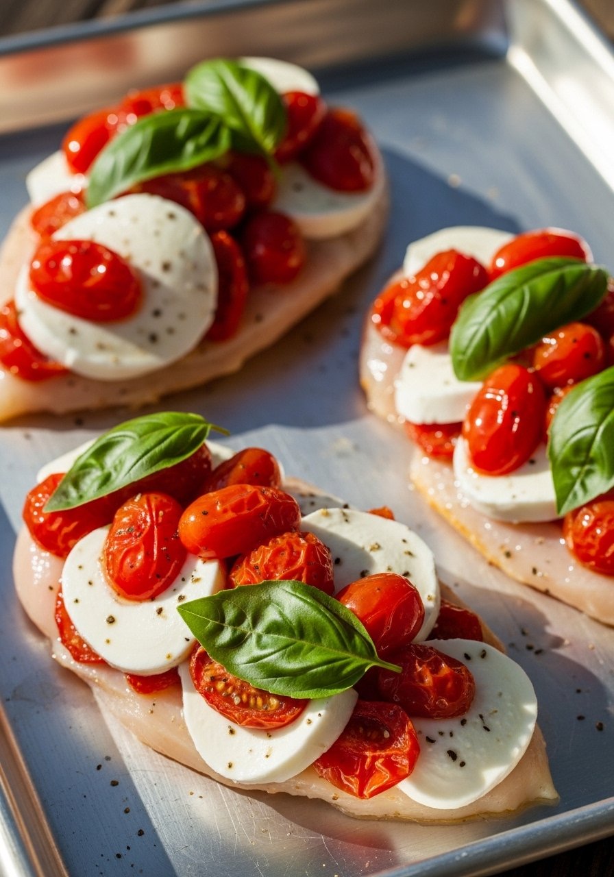 - Top With Mozzarella: Lay mozzarella slices on chicken and return to oven 2–3 minutes until cheese softens.