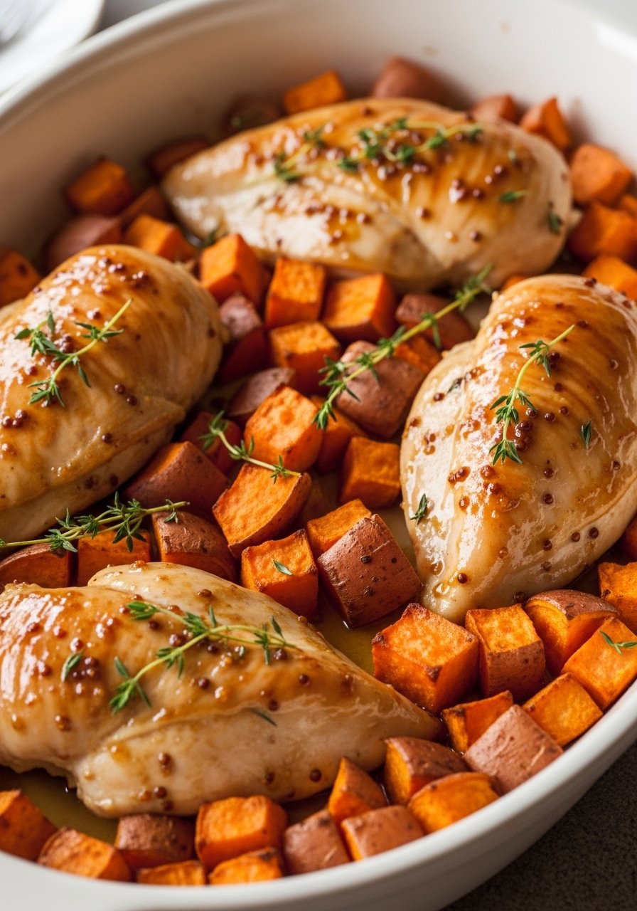 Sweet and tangy honey mustard coats tender chicken and caramelized sweet potatoes. A balanced weeknight meal that's both comforting and bright.