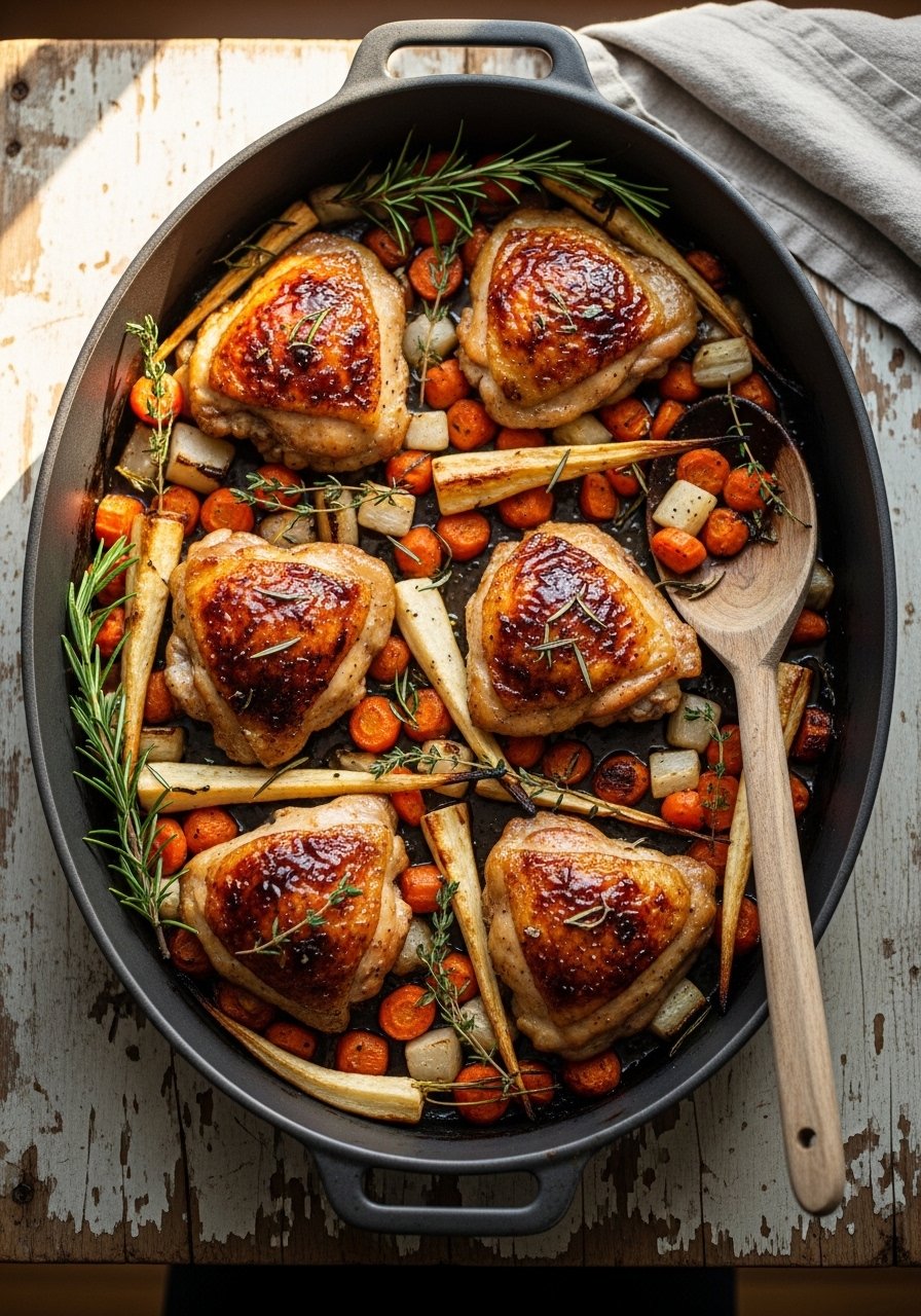 - Arrange & Roast: Place thighs skin-side up among potatoes. Roast 35–40 minutes until skin is crispy and chicken reaches 165°F (74°C).
