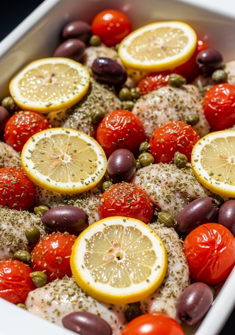 - Preheat & Arrange: Preheat oven to 400°F (200°C). Arrange chicken in a baking dish, scatter tomatoes, olives, capers, lemon, and garlic around.