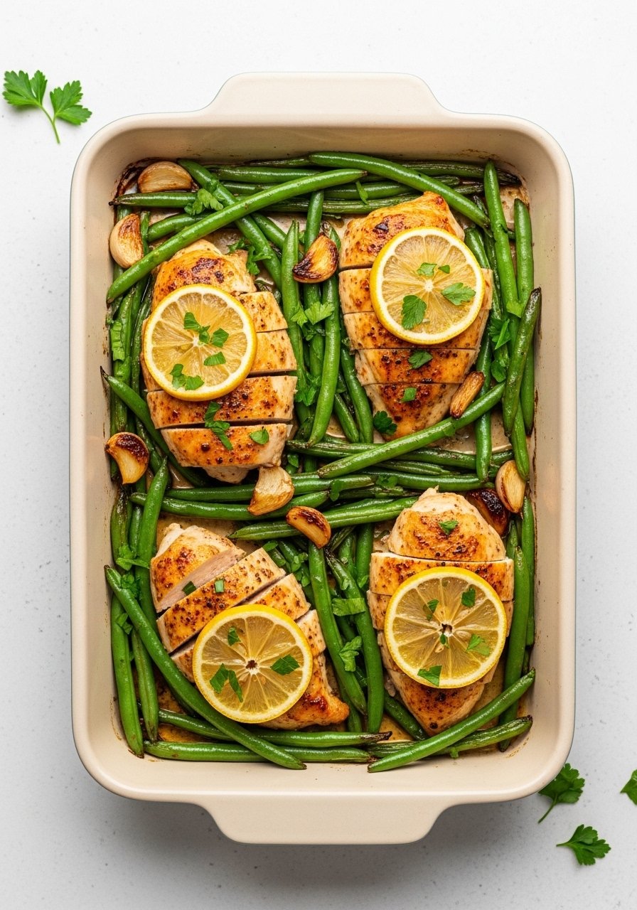 - Coat & Arrange: Place chicken breasts and green beans in a single layer on a baking dish. Pour lemon-garlic mixture over top.