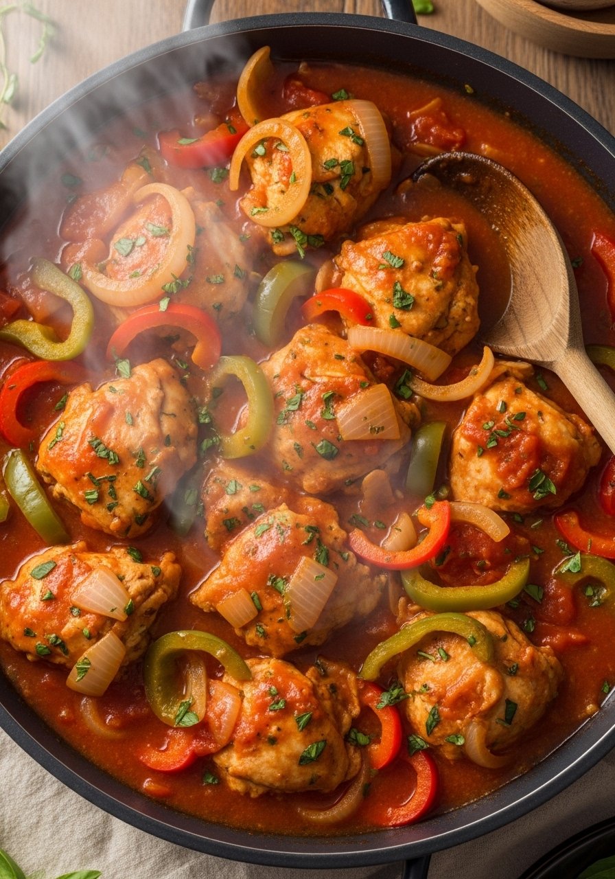 Classic Italian-style chicken baked in a savory tomato sauce with peppers and mushrooms—comforting and great over polenta or pasta.