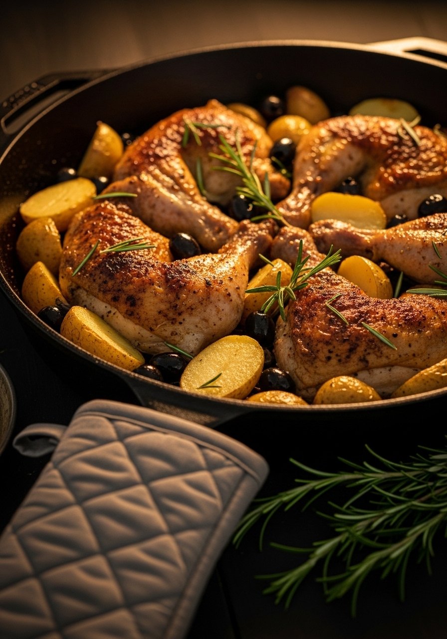 - Arrange Chicken: Nestle chicken among potatoes in a cast-iron skillet or roasting pan and sprinkle olives around.