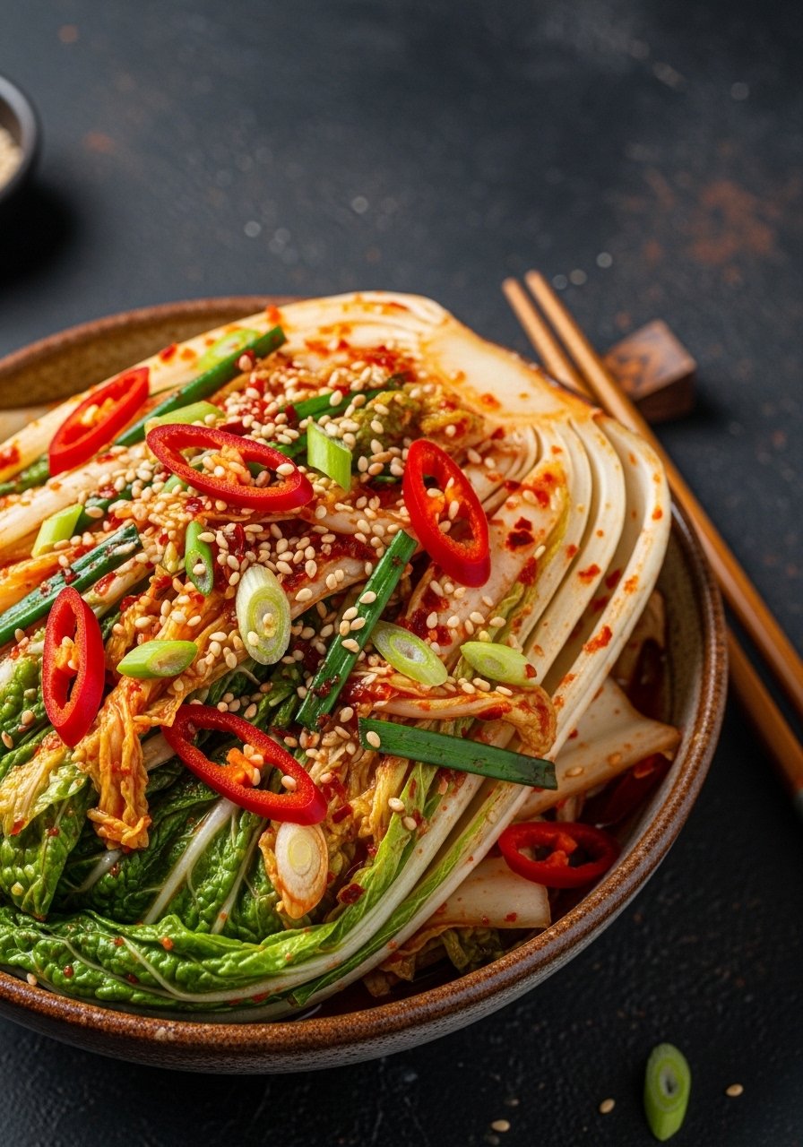 Kimchi is bold, spicy, and packed with probiotics from lactic fermentation. It brightens rice bowls, soups, and grilled proteins with umami and heat.