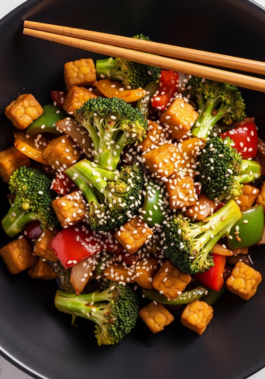 Tempeh is fermented soy with firm texture and nutty flavor. Stir-frying keeps it crisp and pairs well with ginger, garlic, and a tangy soy glaze for a hearty meal.