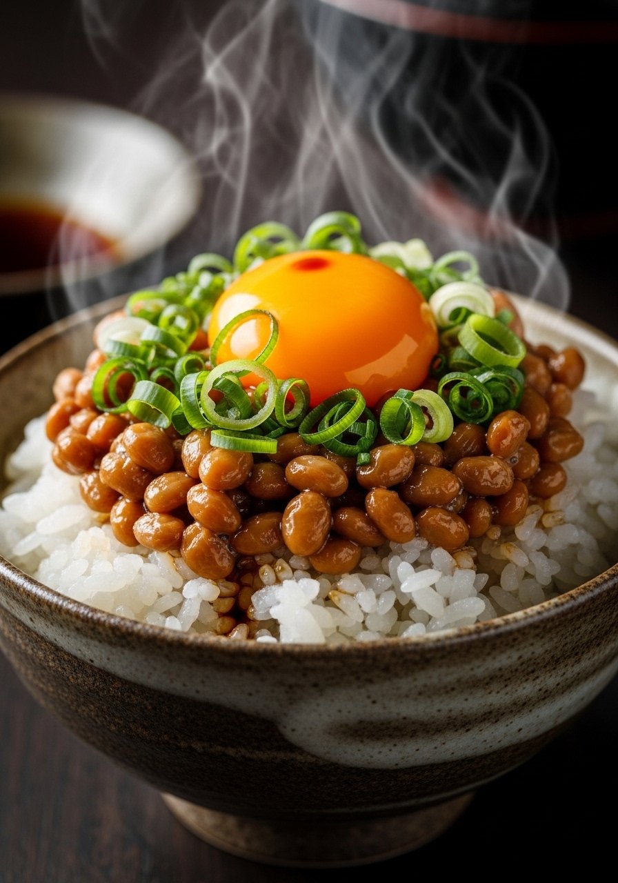 Natto is sticky fermented soy with a strong flavor and probiotic benefit. Serve it over hot rice with scallion and soy for a quick, traditional Japanese breakfast bowl.