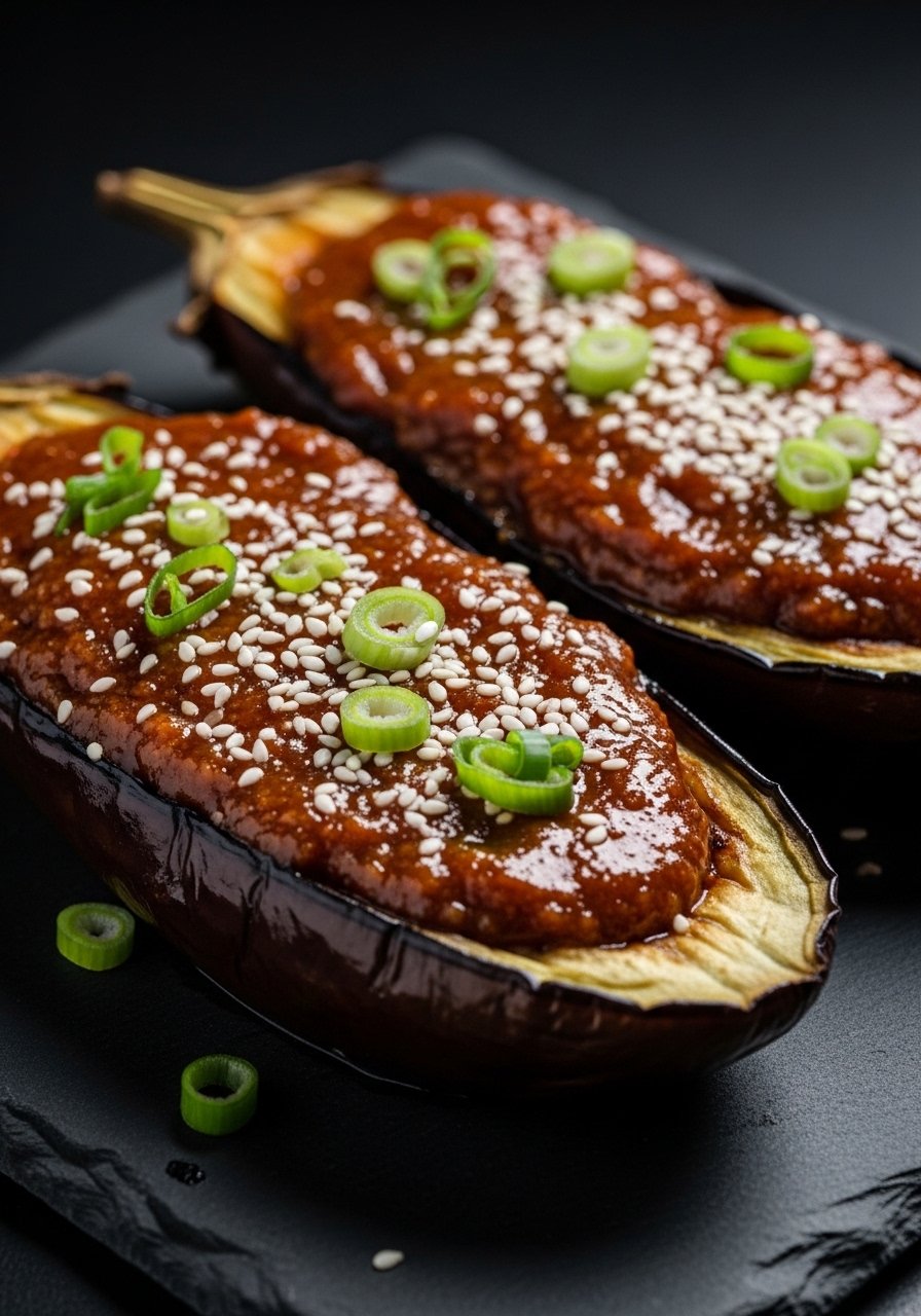- Broil: Brush glaze on eggplant and broil 2–3 minutes until caramelized. Serve with scallion and sesame seeds.