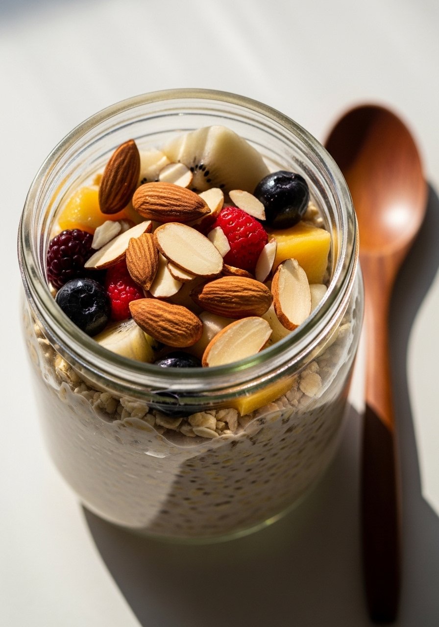 - Mix Base — In a jar, combine oats, kefir, milk, chia seeds, and maple syrup. Stir well.