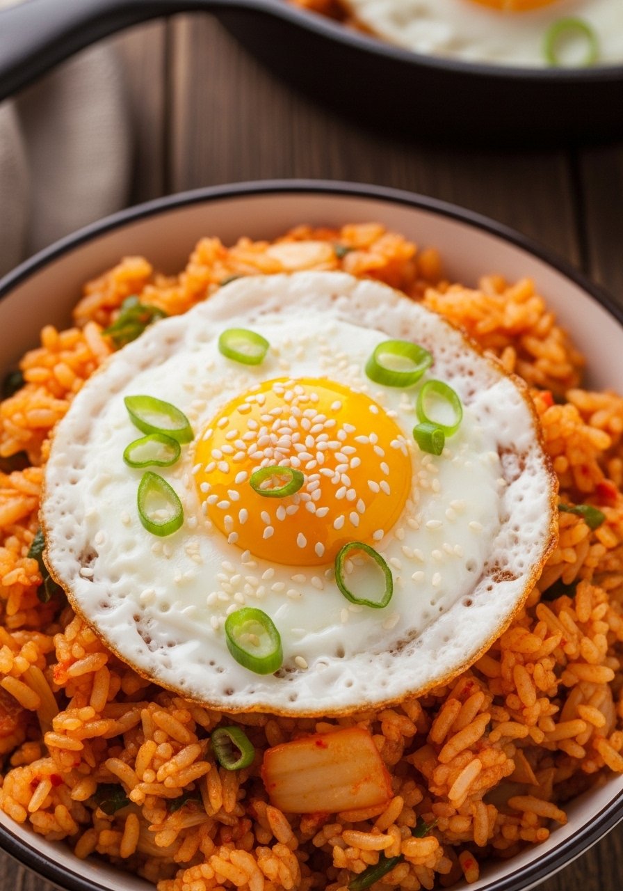 - Finish — Push rice aside, fry egg sunny-side-up, then mix yolk through. Drizzle sesame oil and garnish.