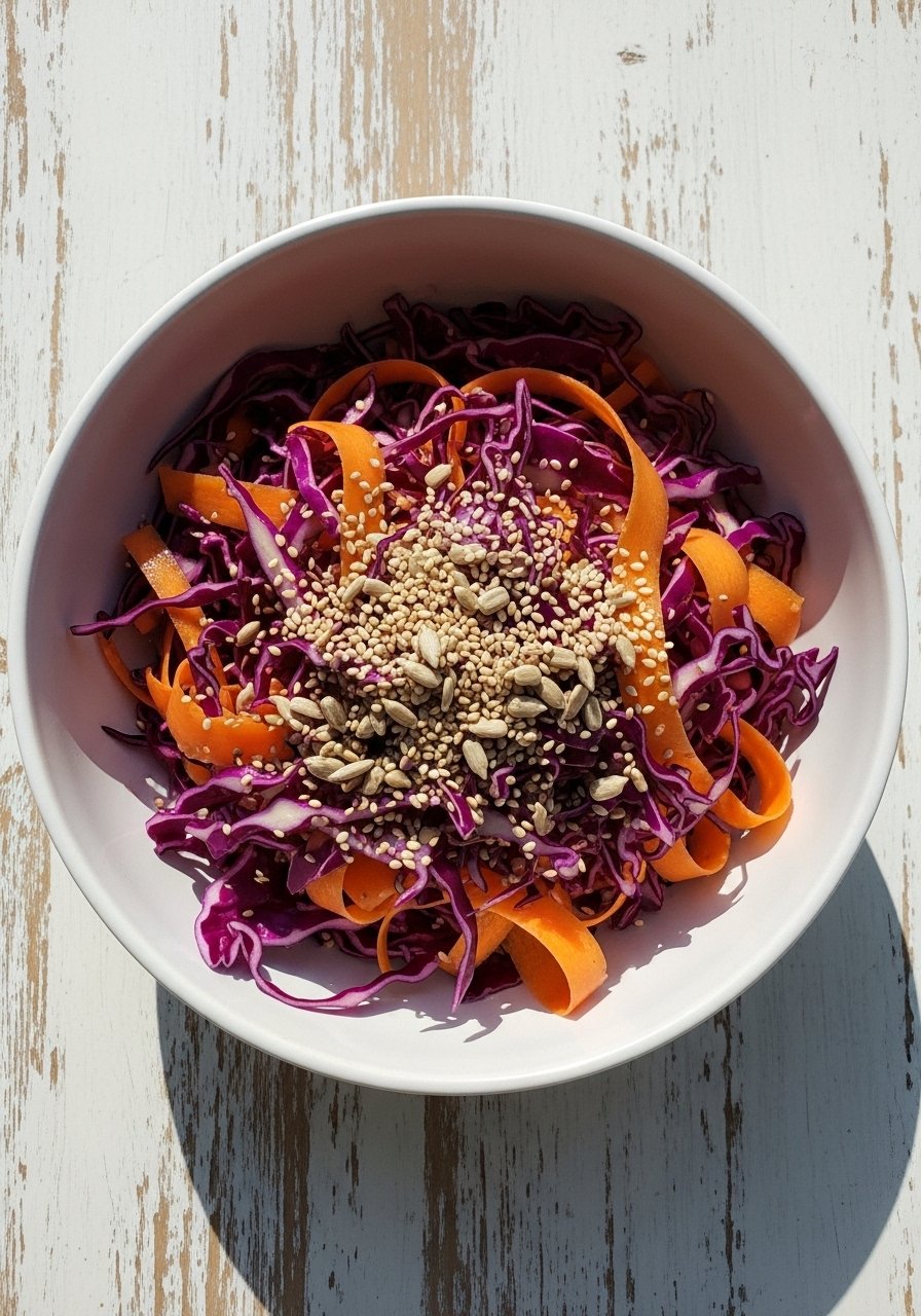 Vibrant and crunchy, fermented red cabbage slaw is tangy and colorful. It’s a lively side for tacos, bowls, or roasted proteins.