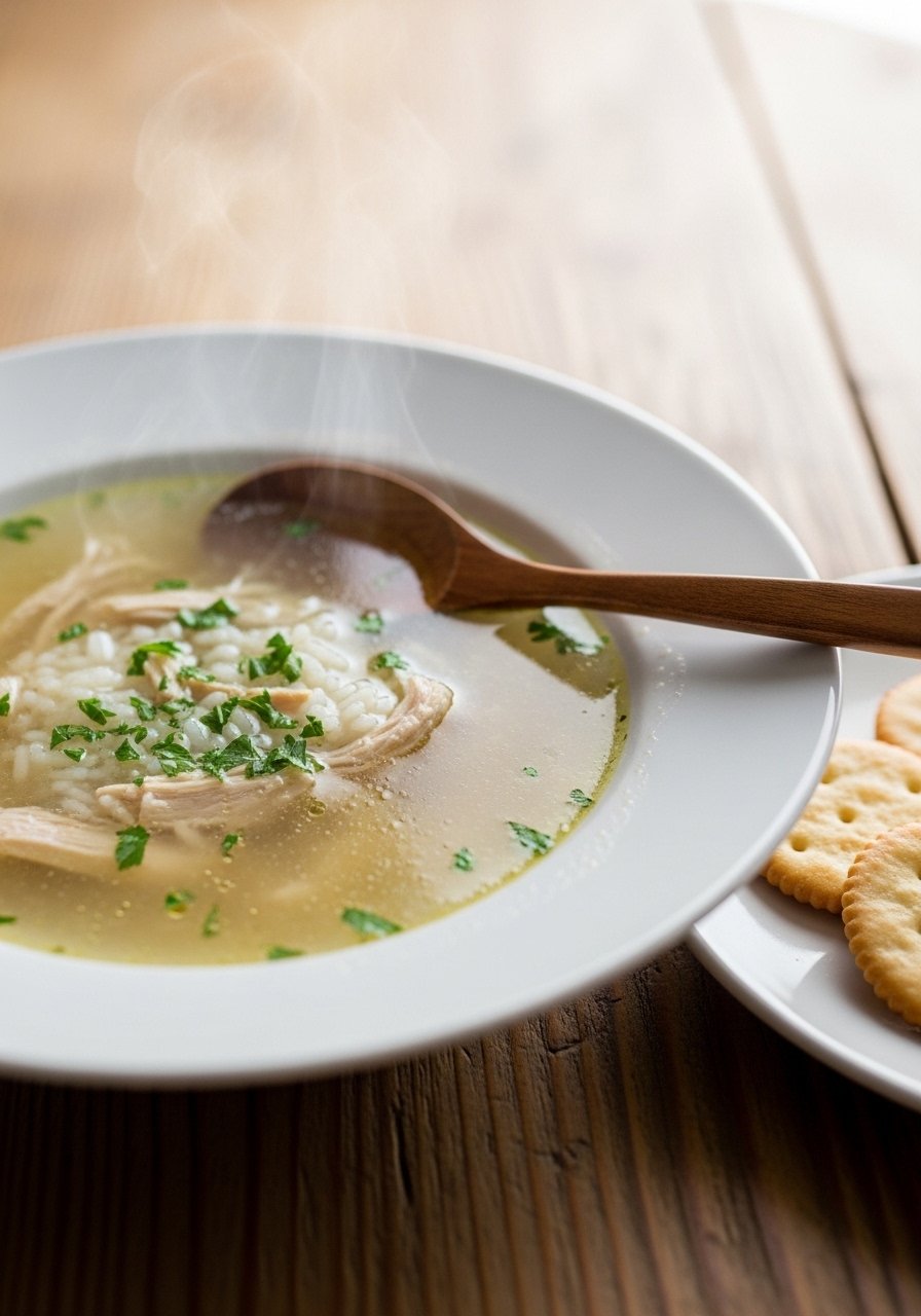 A light, clear chicken and rice soup with tender chicken and soft rice. It’s hydrating, mild, and easy on digestion—warm broth soothes while carbs provide gentle energy.