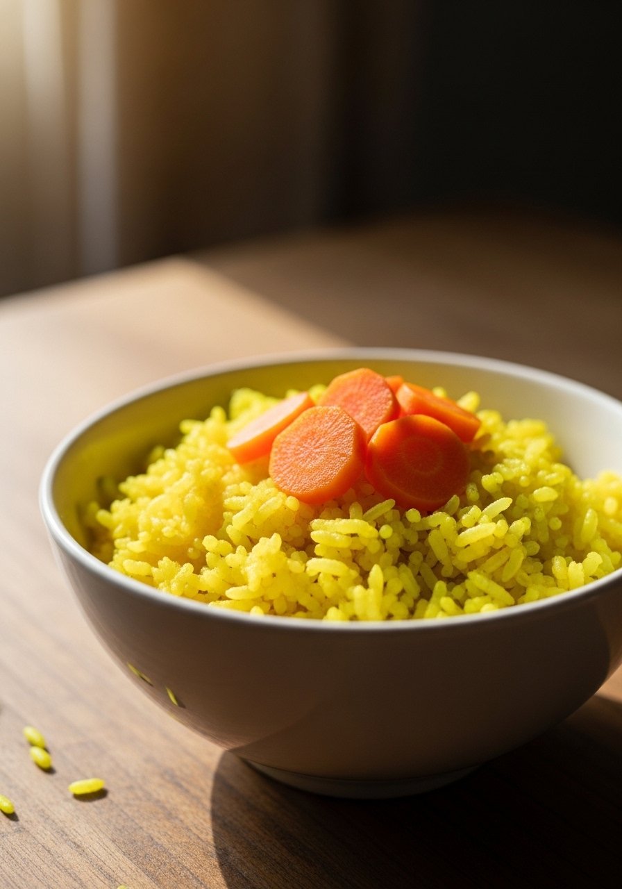 Mild turmeric rice with tender carrots offers gentle anti-inflammatory benefits. Keep turmeric light to avoid strong flavor—pair with plain protein if desired.