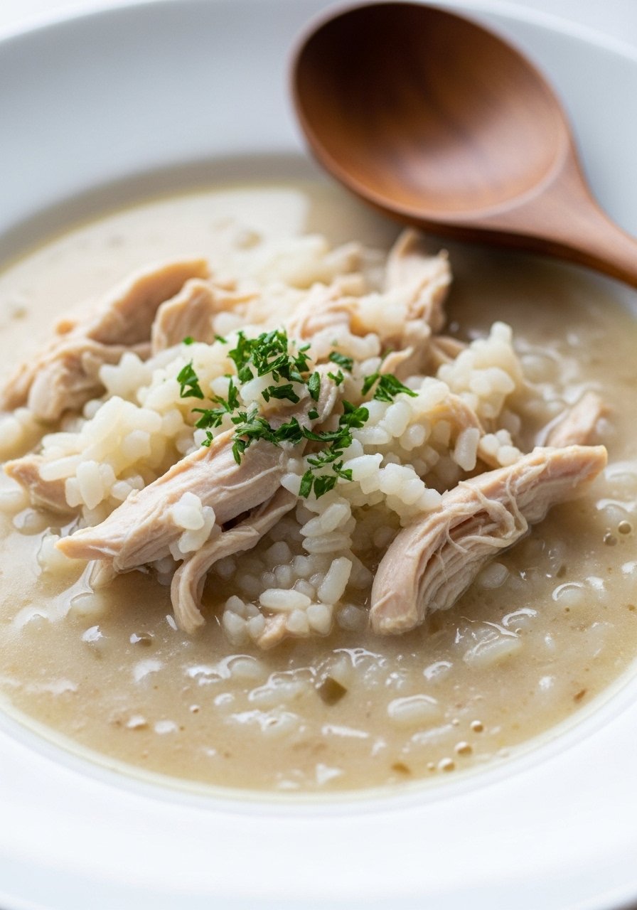This soup is silky, savory, and soothing. Tender shredded chicken and soft rice swim in a gently seasoned broth thickened with milk for a comforting, easy-to-eat bowl that warms you from the inside out.