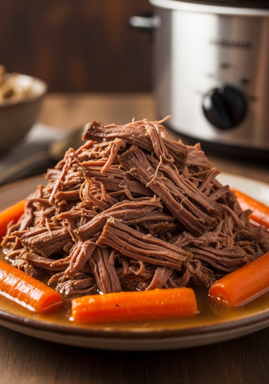 - Cook low and slow: Cover and cook on low for 7–8 hours, or high for 4–5 hours, until beef pulls apart easily with forks.