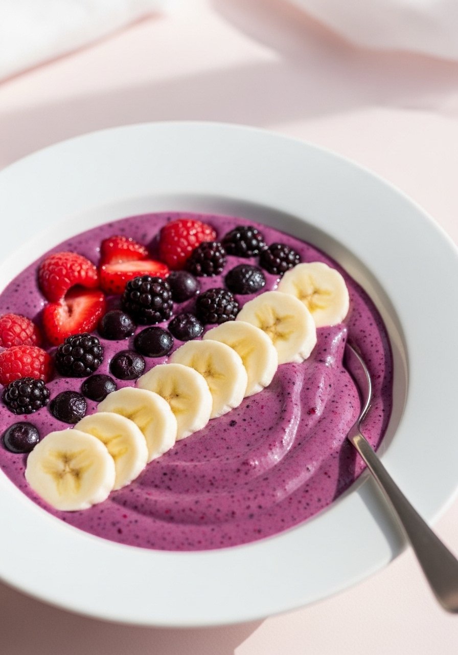 - Blend: Combine berries, yogurt, banana, and liquid in a blender. Blend until thick and smooth.