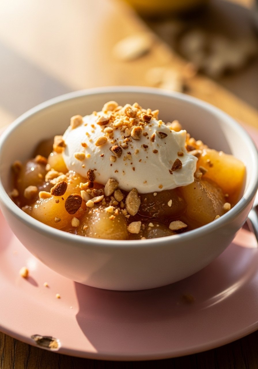 Slow-cooked pear compote is tender and lightly spiced; served with mascarpone it’s a soft dessert that’s elegant and easy to eat. Toasted almonds add optional, finely chopped texture.