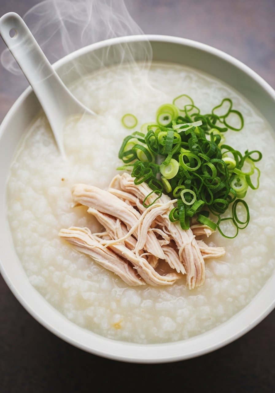 Congee is warm, porridge-like, and very easy to swallow. Shredded chicken adds protein without tough fibers, and the texture is adjustable with broth.