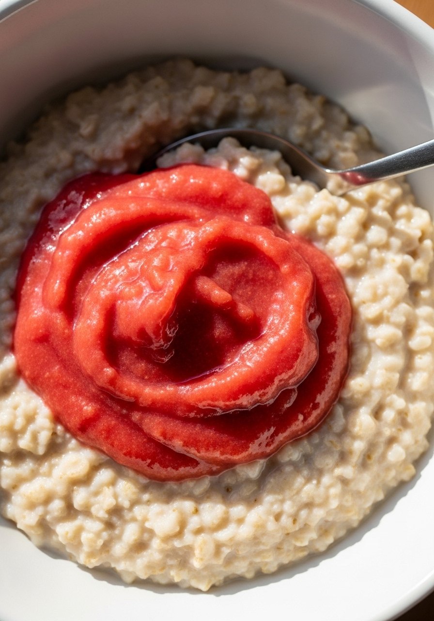 - Combine: Spoon fruit purée over oatmeal and swirl gently.